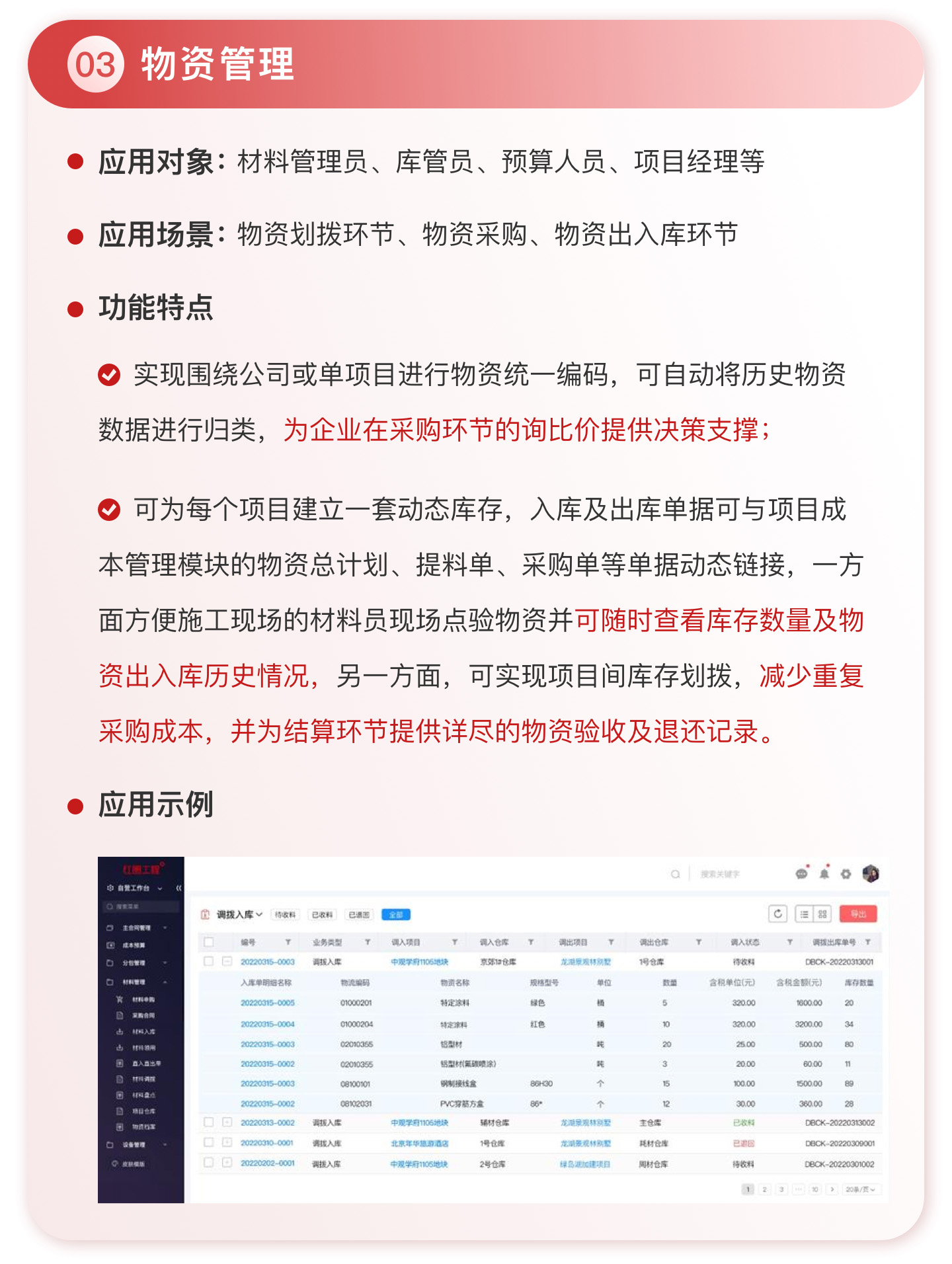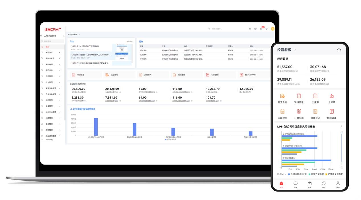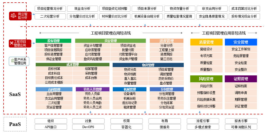 在工程項目管理領域,紅圈在 PaaS 平臺基礎上深入結(jié)合建筑工程企業(yè)的業(yè)務場景,針對其現(xiàn)金流管理薄弱、成本不可控、項目進度滯后、質(zhì)量問題頻發(fā)和安全風險較多等痛點,通過資金管理、成本管理、物資管理、安全質(zhì)量管理、投標管理、勞務管理、證照管理等功能模塊,使執(zhí)行人員業(yè)務流程標準化、透明化。