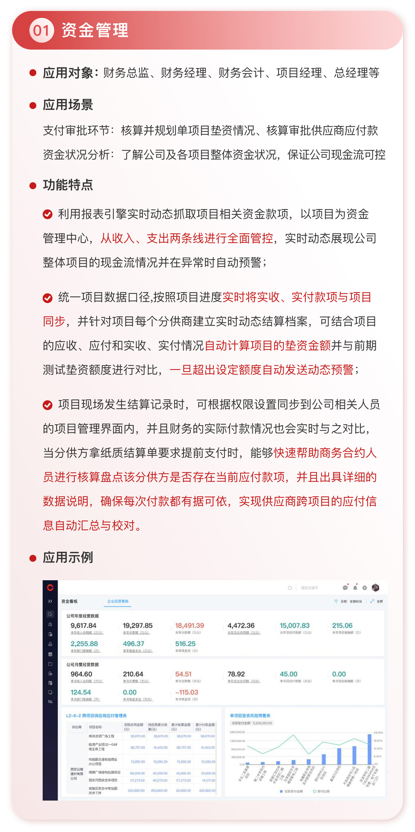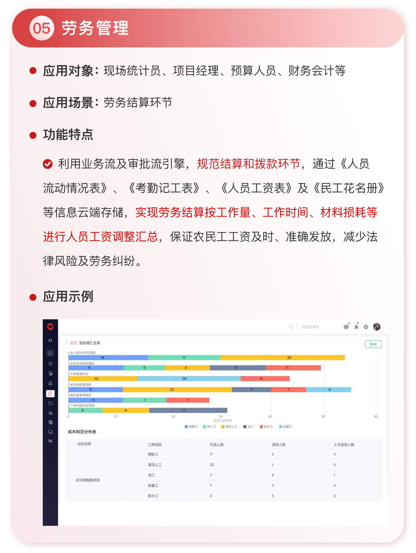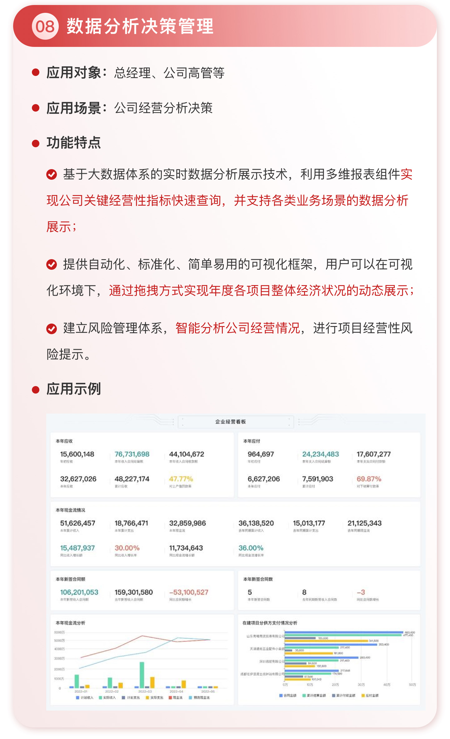 此外,紅圈系統(tǒng)能夠為建筑工程企業(yè)決策者實時呈現(xiàn)動態(tài)數(shù)據(jù)、提供智能數(shù)據(jù)分析,讓管理者實時了解項目的整體運營效率及效益是否達標、經(jīng)營風險是否可控,滿足建筑工程企業(yè)數(shù)字化管理升級的需求,提升企業(yè)經(jīng)營管理能力,實現(xiàn)工程項目施工全生命周期的降本增效。該產(chǎn)品主要應用于產(chǎn)值為 5,000 萬-20 億的建筑工程行業(yè)企業(yè)。