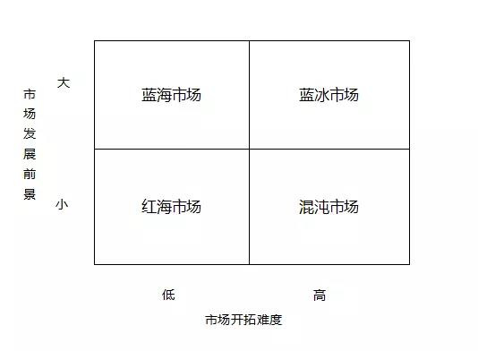 我們可以從市場(chǎng)開(kāi)拓難度和市場(chǎng)發(fā)展前景兩個(gè)維度分析不同類型的市場(chǎng)。混沌市場(chǎng)的發(fā)展路徑不連續(xù),開(kāi)拓難度高,未來(lái)方向不確定,發(fā)展前景小;紅海市場(chǎng)已經(jīng)相當(dāng)成熟,開(kāi)拓難度最低,市場(chǎng)競(jìng)爭(zhēng)激烈,發(fā)展前景小;藍(lán)海市場(chǎng)相對(duì)藍(lán)冰市場(chǎng)而言,開(kāi)發(fā)難度較低,藍(lán)海市場(chǎng)和藍(lán)冰市場(chǎng)同樣市場(chǎng)前景較大。