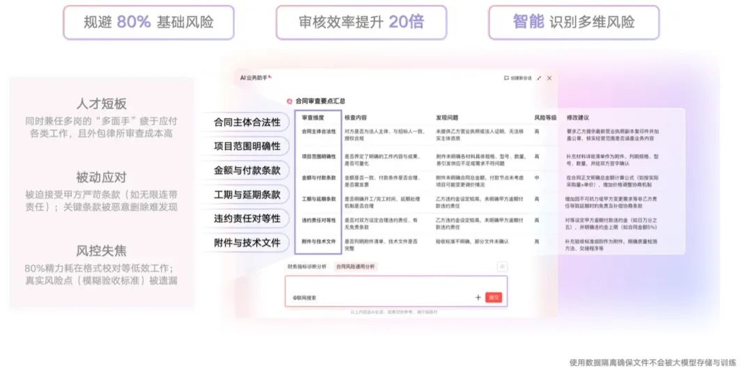 · AI自動識別風險:核查內容,發現潛在風險,評估風險等級并提供修改建議,幫助快速審查合同條款。