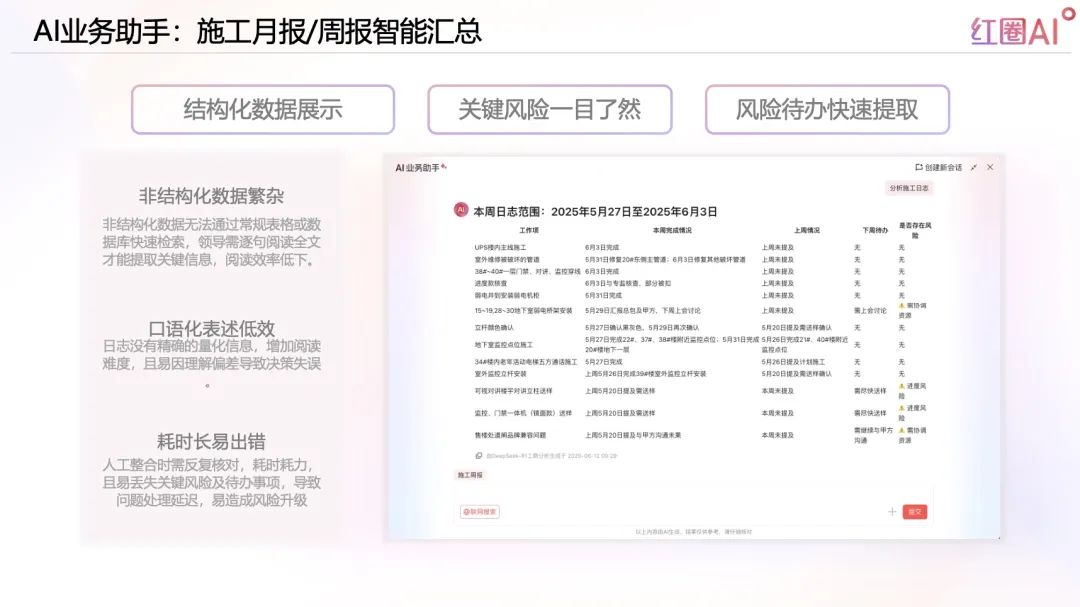 紅圈AI通過智能化技術對施工報表進行自動匯總和提取,確保企業高效、精準地掌握項目進展和潛在風險。
