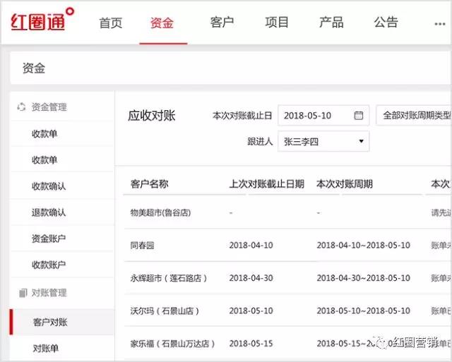 在6.5.3版本,紅圈后臺(tái)的資金功能中新增“客戶(hù)對(duì)賬”,為每個(gè)客戶(hù)設(shè)定對(duì)賬周期、定期生成對(duì)賬單。對(duì)賬單清晰呈現(xiàn)每個(gè)客戶(hù)在該對(duì)賬周期的應(yīng)收、已收、期末應(yīng)收金額以及發(fā)生金額明細(xì),大大提高對(duì)賬效率。