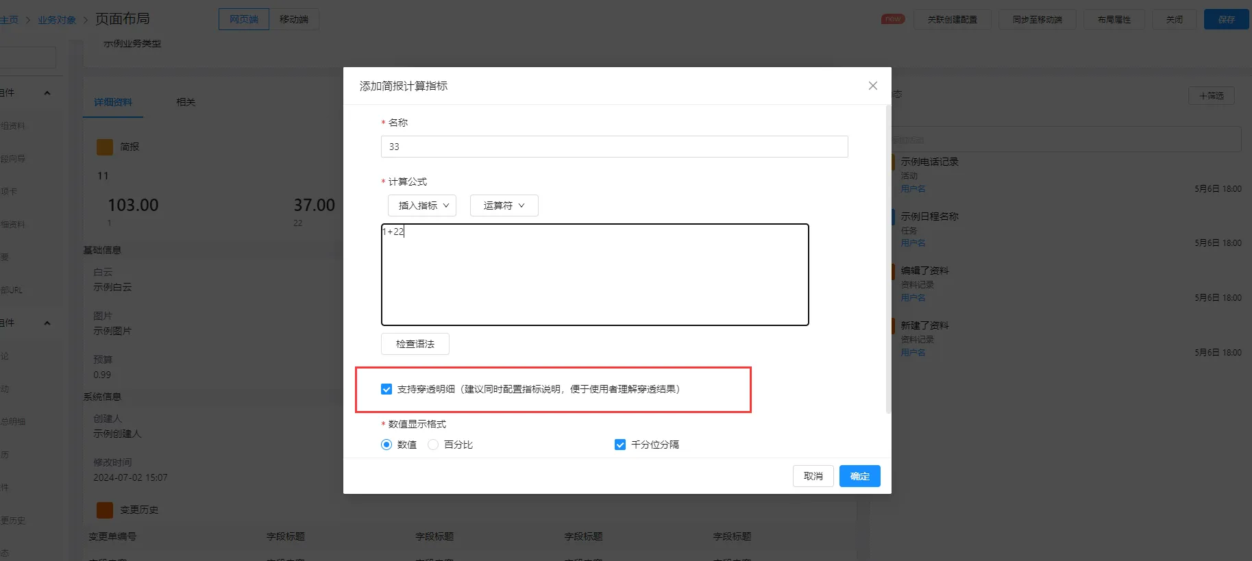 詳情頁簡報中的計算字段勾選支持穿透明細,前臺使用時可以穿透查看所有相關指標對應的列表頁數據