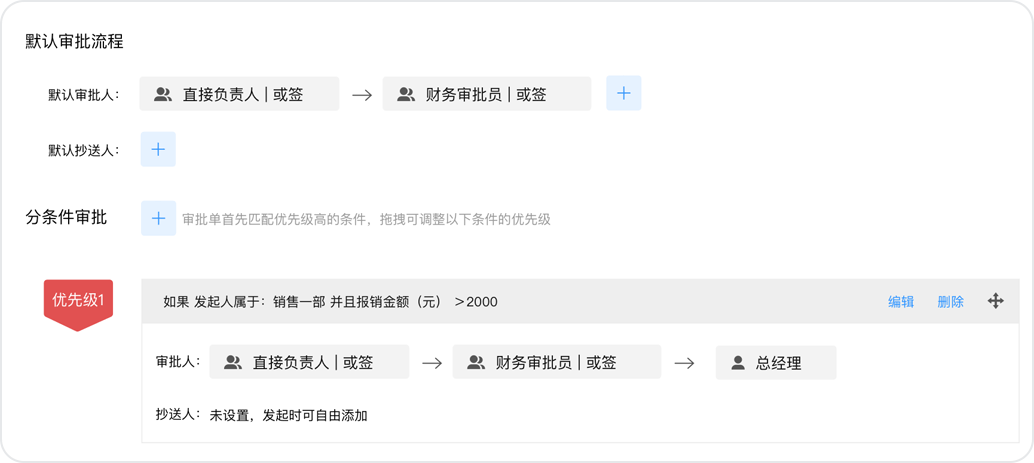 小王這次要報(bào)銷(xiāo)2500元的出差費(fèi)用,而公司規(guī)定報(bào)銷(xiāo)超出2000元就需要總經(jīng)理進(jìn)行額外審批。這種情況可以通過(guò)設(shè)置“分條件審批”功能來(lái)實(shí)現(xiàn),將報(bào)銷(xiāo)金額是否大于2000作為判斷應(yīng)該走哪一條流程的條件:1)金額小于等于2000元時(shí),流程按“直接負(fù)責(zé)人-財(cái)務(wù)審核員”執(zhí)行;2)金額大于2000元時(shí),流程按“直接負(fù)責(zé)人-財(cái)務(wù)審核員-總經(jīng)理”執(zhí)行。分條件審批不僅可以設(shè)置按金額判斷,還可以設(shè)置按發(fā)起人部門(mén)、報(bào)銷(xiāo)類(lèi)型等判斷。