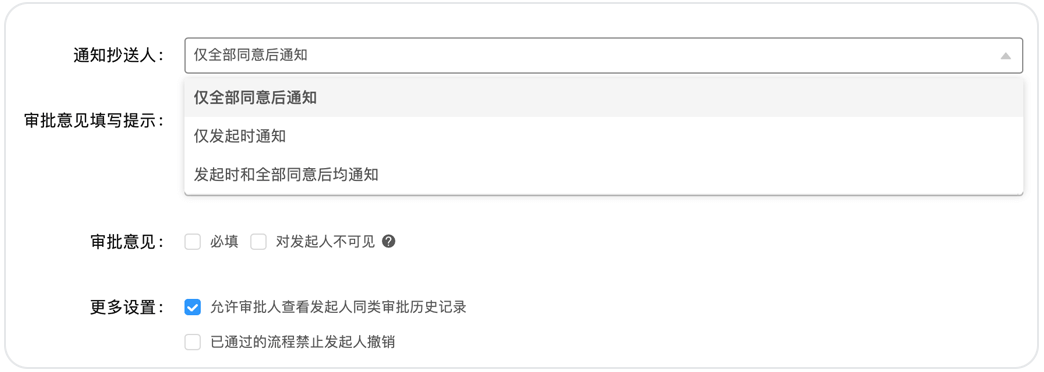 小王的出差報(bào)銷(xiāo)最終通過(guò)了,這時(shí)還需要抄送給辦公室的行政同事以便日后進(jìn)行成本分析。過(guò)去,報(bào)銷(xiāo)審批一經(jīng)發(fā)起就抄送給了行政同事,但有些審批后期撤銷(xiāo)了但沒(méi)有通知行政同事,造成后期分析時(shí)數(shù)據(jù)存在誤差,現(xiàn)在可以通過(guò)設(shè)置“僅全部同意后通知”的抄送模式來(lái)避免這一問(wèn)題。抄送共有3種模式,企業(yè)可根據(jù)實(shí)際場(chǎng)景靈活選擇。