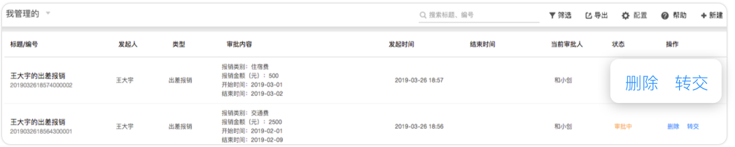 小王平時(shí)不僅會(huì)提交“出差報(bào)銷(xiāo)”這種辦公類(lèi)審批,還會(huì)提交“合同審核”這種經(jīng)營(yíng)類(lèi)審批。公司希望每類(lèi)審批都由專(zhuān)人來(lái)管理模板與數(shù)據(jù),防止敏感數(shù)據(jù)內(nèi)部泄露。這時(shí)公司可以為每個(gè)審批設(shè)置“模板管理員”,由該審批生成的全部數(shù)據(jù)將只能由這個(gè)模板管理員維護(hù)并導(dǎo)出。同時(shí)他也可以將審批中的流程轉(zhuǎn)交給其他人,以避免出現(xiàn)審批人休假或離職后流程卡住的情況。模板管理員還可以協(xié)助企業(yè)管理員來(lái)編輯審批模板,有效分擔(dān)工作。