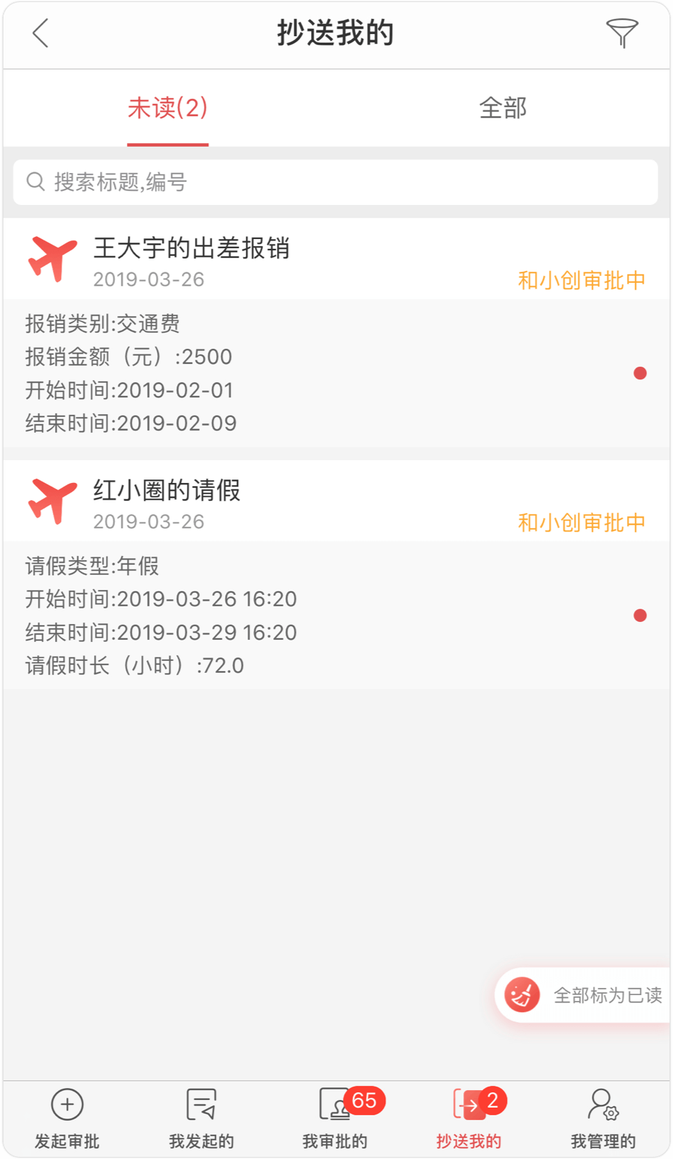 審批列表中的信息可按規(guī)律配置透出信息;抄送列表增加未讀狀態(tài),并可一鍵全部已讀;審批詳情頁(yè)信息展示更友好、高效。