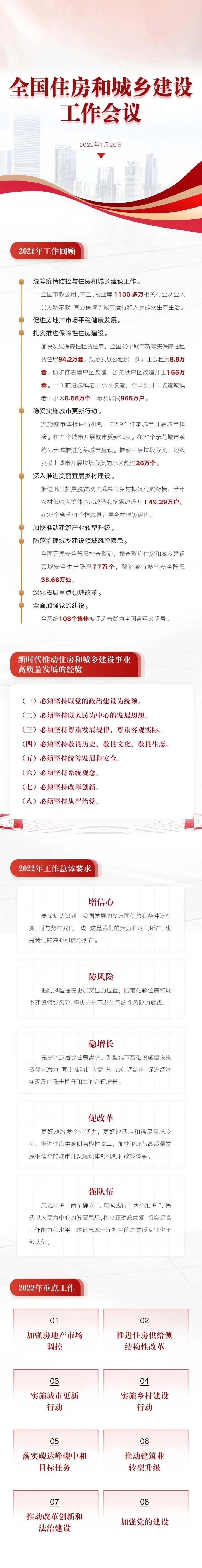 1月20日,全國住房和城鄉建設工作會議在北京以視頻形式召開。會議深入學習貫徹習近平新時代中國特色社會主義思想,全面貫徹落實黨的十九大和十九屆歷次全會精神、中央經濟工作會議精神,總結2021年工作,分析形勢和問題,研究部署2022年工作。住房和城鄉建設部黨組書記、部長王蒙徽作工作報告。