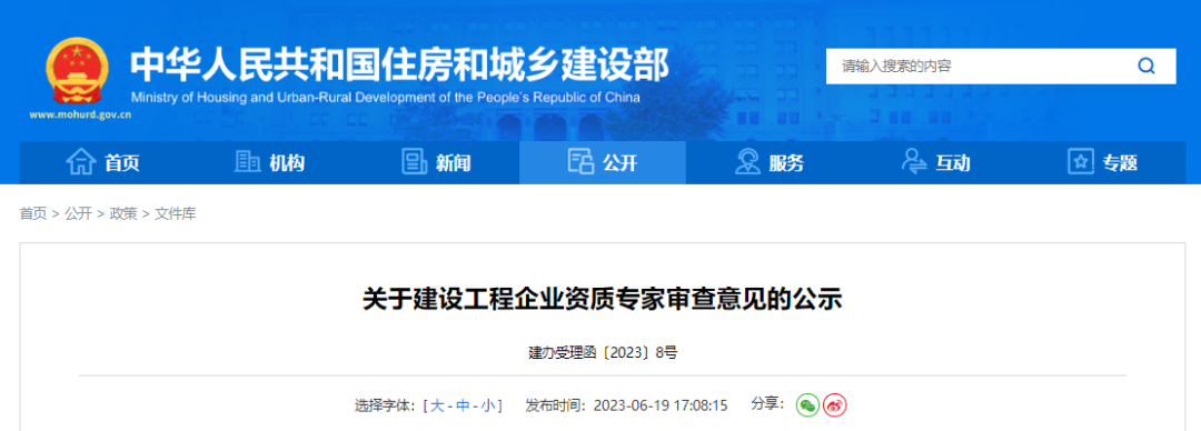 6月19日,住建部官網(wǎng)公示新一批建設(shè)工程企業(yè)資質(zhì)專家審查意見,其中,僅同意一家建筑業(yè)企業(yè)升級特級資質(zhì):