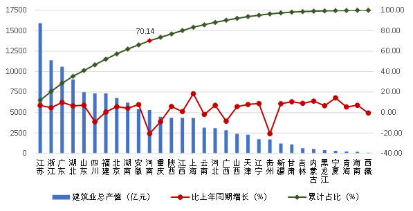 2023年上半年全國(guó)建筑業(yè)基本情況經(jīng)初步核算,2023年上半年我國(guó)國(guó)內(nèi)生產(chǎn)總值 593034億元,同比增長(zhǎng)5.5%。上半年建筑業(yè)實(shí)現(xiàn)增加值37003億元,同比增長(zhǎng)7.7%,增速高于國(guó)內(nèi)生產(chǎn)總值增速 2.2個(gè)百分點(diǎn)。建筑業(yè)增加值占國(guó)內(nèi)生產(chǎn)總值的比重為6.24%。(二)建筑安裝工程投資、建筑業(yè)總產(chǎn)值情況2023年上半年,全國(guó)固定資產(chǎn)投資(不含農(nóng)戶(hù))243113億元,按可比口徑計(jì)算同比增長(zhǎng)3.8%,其中,建筑安裝工程投資同比增長(zhǎng)3.2%,比全國(guó)固定資產(chǎn)投資(不含農(nóng)戶(hù))增幅低0.6個(gè)百分點(diǎn)。2023年上半年,全國(guó)建筑業(yè)企業(yè)(指具有資質(zhì)等級(jí)的總承包和專(zhuān)業(yè)承包建筑業(yè)企業(yè),不含勞務(wù)分包建筑業(yè)企業(yè),下同)完成建筑業(yè)總產(chǎn)值132260.74億元,同比增長(zhǎng)2.54%,比全國(guó)固定資產(chǎn)投資(不含農(nóng)戶(hù))增幅低1.26個(gè)百分點(diǎn);建筑業(yè)企業(yè)完成竣工產(chǎn)值47527.97億元,同比增長(zhǎng)2.13%;在外省完成產(chǎn)值45709.35億元,同比增長(zhǎng)3.64%,在外省完成產(chǎn)值占建筑業(yè)總產(chǎn)值的34.56%。(三)建筑業(yè)企業(yè)數(shù)量、從業(yè)人數(shù)和勞動(dòng)生產(chǎn)率情況截至2023年6月底,全國(guó)有施工活動(dòng)的建筑業(yè)企業(yè)139740個(gè),同比增長(zhǎng)7.91%;從業(yè)人數(shù)4016.41 萬(wàn)人,同比減少3.79%。其中,國(guó)有及國(guó)有控股建筑業(yè)企業(yè)8712個(gè),比上年同期增加926個(gè),占建筑業(yè)企業(yè)總數(shù)的6.23%。2023年上半年,按建筑業(yè)總產(chǎn)值計(jì)算的勞動(dòng)生產(chǎn)率為282986元 /人,同比增長(zhǎng) 1.50%。(四)建筑業(yè)企業(yè)簽訂合同總額、新簽合同額情況2023年上半年,全國(guó)建筑業(yè)企業(yè)簽訂合同總額514959.2億元,同比增長(zhǎng)5.03%,其中新簽合同額154393.7億元,同比增長(zhǎng) 3.11%。2023年上半年,房屋施工面積117.76億平方米,同比減少2.46%。其中,新開(kāi)工面積17.69億平方米,比上年同期降低10.28%。房屋竣工面積14.26億平方米,同比減少3.08%。從全國(guó)建筑業(yè)企業(yè)房屋竣工面積構(gòu)成情況看,住宅房屋竣工面積占最大比重,為 61.52%;廠(chǎng)房及建筑物竣工面積占17.63%;商業(yè)及服務(wù)用房屋竣工面積占 6.62%;其他種類(lèi)房屋竣工面積占比均在5%以下。2023年1-6月,我國(guó)對(duì)外承包工程業(yè)務(wù)完成營(yíng)業(yè)額4901億元人民幣,同比增長(zhǎng)7%(折合707.3億美元,同比增長(zhǎng)0.1%),新簽合同額6559.8億元人民幣,同比下降2.3%(折合946.7億美元,同比下降8.6%)。我國(guó)企業(yè)在“一帶一路”沿線(xiàn)國(guó)家新簽承包工程合同額3301億元人民幣,同比下降2.5%(折合476.4億美元,同比下降8.8%),占同期我國(guó)對(duì)外承包工程新簽合同額的50.3%;完成營(yíng)業(yè)額2777.2億元人民幣,同比增長(zhǎng)11.5%(折合400.8億美元,同比增長(zhǎng)4.4%),占同期總額的56.7%。2023年1-6月,我國(guó)企業(yè)共向境外派出各類(lèi)勞務(wù)人員16.7萬(wàn)人,較上年同期增加4.6萬(wàn)人;其中承包工程項(xiàng)下派出5.2萬(wàn)人,勞務(wù)合作項(xiàng)下派出11.5萬(wàn)人。6月末在外各類(lèi)勞務(wù)人員56萬(wàn)人。2023年上半年,江蘇、浙江、廣東建筑業(yè)總產(chǎn)值均超過(guò)了1萬(wàn)億元,分別達(dá)到15916.78億元、11375.78億元和10586.19億元,分別占全國(guó)建筑業(yè)總產(chǎn)值的 12.03%、8.61%和8.00%。除江蘇、浙江、廣東外,總產(chǎn)值超過(guò)5000億元的還有湖北、山東、四川、福建、北京、湖南、安徽、河南等8 個(gè)地區(qū),上述 11 省市完成的建筑業(yè)總產(chǎn)值占全國(guó)建筑業(yè)總產(chǎn)值的 70.14%。從各地區(qū)建筑業(yè)總產(chǎn)值增長(zhǎng)情況看,24個(gè)地區(qū)的建筑業(yè)總產(chǎn)值較上年同期都有不同幅度的增長(zhǎng)。其中,上海的增幅最大,達(dá)到了18.44%。寧夏、內(nèi)蒙古、甘肅等3個(gè)地區(qū)的增幅在10%以上。7個(gè)地區(qū)的建筑業(yè)總產(chǎn)值較上年同期出現(xiàn)下降,其中貴州、河南的降幅均超過(guò)20%(圖 1)。 圖 1 2023 年上半年各地區(qū)建筑業(yè)總產(chǎn)值及其增長(zhǎng)情況