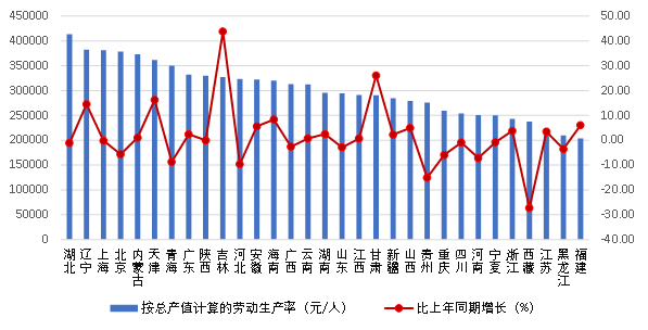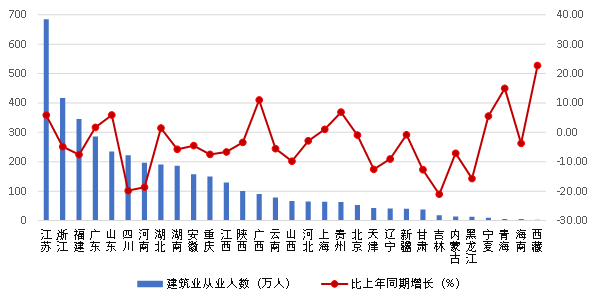 圖 3 2023 年上半年各地區(qū)建筑業(yè)企業(yè)數(shù)量及其增長(zhǎng)情況2023年上半年,全國(guó)建筑業(yè)從業(yè)人數(shù)超過(guò)百萬(wàn)的地區(qū)仍然是 13 個(gè)。江蘇、浙江依然是從業(yè)人數(shù)大省,人數(shù)分別達(dá)到 684.97萬(wàn)人和 416.60 萬(wàn)人。福建、廣東、山東、四川等4省從業(yè)人數(shù)均超過(guò) 200 萬(wàn)人。與上年同期相比,10個(gè)地區(qū)的從業(yè)人數(shù)增加,其中增加人數(shù)最多的是江蘇,增加 37.87萬(wàn)人;18個(gè)地區(qū)的從業(yè)人數(shù)減少,其中減少最多的是四川,減少55.00萬(wàn)人。從業(yè)人數(shù)增幅最大的是西藏,增幅為22.71%;降幅最大的是吉林,下降了21.05%(圖 4)。 圖 4 2023 年上半年各地區(qū)建筑業(yè)從業(yè)人數(shù)及其增長(zhǎng)情況2023年上半年,按建筑業(yè)總產(chǎn)值計(jì)算的勞動(dòng)生產(chǎn)率排序前三位的地區(qū)是湖北、遼寧和上海,分別為413177元/人、382102/人和381217元/人。16個(gè)地區(qū)按建筑業(yè)總產(chǎn)值計(jì)算的勞動(dòng)生產(chǎn)率保持增長(zhǎng),其中增幅超過(guò)10%的有吉林、甘肅、天津和遼寧4個(gè)地區(qū);15個(gè)地區(qū)按建筑業(yè)總產(chǎn)值計(jì)算的勞動(dòng)生產(chǎn)率出現(xiàn)下降,其中西藏、貴州的降幅均超過(guò)15%(圖 5)。 圖 5 2023 年上半年各地區(qū)建筑業(yè)勞動(dòng)生產(chǎn)率及其增長(zhǎng)情況