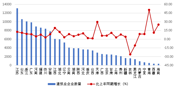 2023年上半年,全國(guó)建筑業(yè)企業(yè)數(shù)量超過(guò)5000家的地區(qū)共11個(gè)。其中,江蘇的企業(yè)數(shù)量最多,達(dá)到13104家。山東、浙江和廣東的企業(yè)數(shù)量均超過(guò) 1萬(wàn)家。與上年同期相比,29個(gè)地區(qū)的企業(yè)數(shù)量增加,其中,青海增速超過(guò)50%,天津、海南的增速均超過(guò)25%;吉林、黑龍江2 個(gè)地區(qū)的企業(yè)數(shù)量減幅超過(guò)10%(圖 3)。