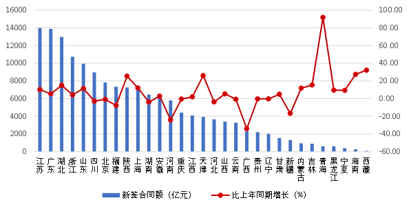圖 6 2023 年上半年各地區(qū)建筑業(yè)企業(yè)合同總額及其增長(zhǎng)情況2023年上半年,江蘇、廣東、湖北、浙江四省建筑業(yè)企業(yè)新簽合同額均超過(guò)10000億元,分別達(dá)到13974.12億元、13882.98億元、12964.71億元和10731.51億元。新簽合同額超過(guò)6000億元的還有山東、四川、北京、福建、陜西、上海、湖南、安徽等8 個(gè)地區(qū)。新簽合同額同比增長(zhǎng)最快的是青海,達(dá)到了91.68%。西藏、海南、天津、陜西、吉林、湖北、上海、內(nèi)蒙古、山東、江蘇的增幅也都超過(guò)了 10%。12個(gè)地區(qū)新簽合同額出現(xiàn)負(fù)增長(zhǎng),其中廣西、河南、新疆的負(fù)增長(zhǎng)均超過(guò)15%(圖7)。圖 7 2023 年上半年各地區(qū)建筑業(yè)企業(yè)新簽合同額及其增長(zhǎng)情況
