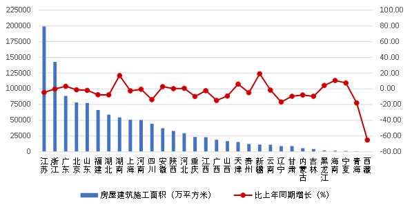 2023年上半年,江蘇、浙江建筑業(yè)企業(yè)房屋建筑施工面積均超過(guò)10億平方米,分別達(dá)到19.90億平方米、14.27億平方米。房屋建筑施工面積超過(guò) 5億平方米的還有廣東、北京、山東、福建、湖北、湖南、上海、河南等 8 個(gè)地區(qū)。房屋建筑施工面積同比增長(zhǎng)最快的是新疆,達(dá)到了19.10%,湖南、海南的增幅也都超過(guò)了10%。21個(gè)地區(qū)房屋建筑施工面積出現(xiàn)負(fù)增長(zhǎng),其中西藏的負(fù)增長(zhǎng)超過(guò)了65%,青海、遼寧、廣西、四川的負(fù)增長(zhǎng)均超過(guò)10%(圖8)。