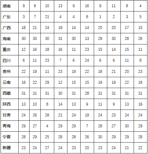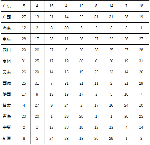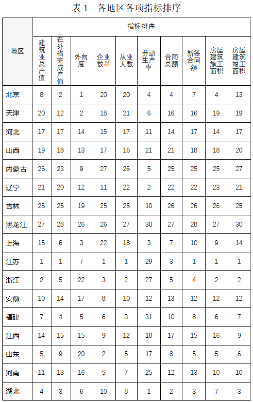 表1和表2分別列出了各地區(qū)各項(xiàng)指標(biāo)及其增長(zhǎng)情況的排序結(jié)果。