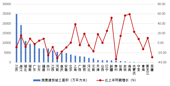 圖 8 2023 年上半年各地區(qū)建筑業(yè)企業(yè)房屋施工面積及其增長(zhǎng)情況2023年上半年,江蘇、浙江、湖北建筑業(yè)企業(yè)房屋建筑竣工面積均超過(guò)1億平方米,分別達(dá)到2.49億平方米、1.93億平方米、1.11億平方米。房屋建筑竣工面積超過(guò) 5000萬(wàn)平方米的還有湖南、廣東、山東、福建、四川、江西、河南等 7個(gè)地區(qū)。海南、吉林、新疆3個(gè)地區(qū)的房屋建筑竣工面積增幅均超過(guò)了50%,上海、遼寧、內(nèi)蒙古的增幅也都超過(guò)了20%。14個(gè)地區(qū)房屋建筑竣工面積出現(xiàn)負(fù)增長(zhǎng),其中貴州、河南、西藏、四川的負(fù)增長(zhǎng)均超過(guò)25%(圖9)。圖 9 2023 年上半年各地區(qū)建筑業(yè)企業(yè)房屋竣工面積及其增長(zhǎng)情況