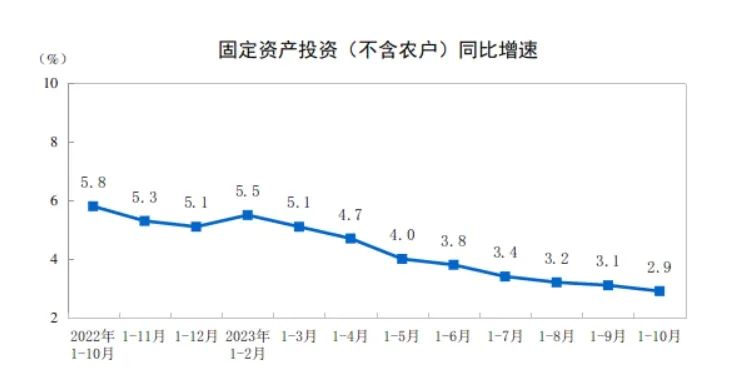 11月15日,國家統(tǒng)計局發(fā)布數(shù)據(jù)顯示,1—10月份,全國固定資產(chǎn)投資(不含農(nóng)戶)419409億元,同比增長2.9%(按可比口徑計算,詳見附注7)。其中,民間固定資產(chǎn)投資215863億元,同比下降0.5%。從環(huán)比看,10月份固定資產(chǎn)投資(不含農(nóng)戶)增長0.10%。