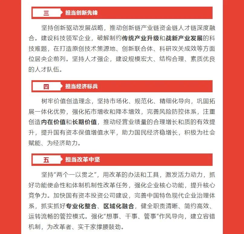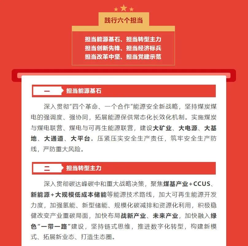 國家能源集團最新確立了“一個目標、三個作用、六個擔當”發(fā)展戰(zhàn)略。一個目標是指“全面建設(shè)世界一流清潔低碳能源科技領(lǐng)軍企業(yè)和一流國有資本投資公司”,三個作用是指發(fā)揮科技創(chuàng)新、產(chǎn)業(yè)控制、安全支撐作用,六個擔當是指擔當能源基石、擔當轉(zhuǎn)型主力、擔當創(chuàng)新先鋒、擔當經(jīng)濟標兵、擔當改革中堅、擔當黨建示范。