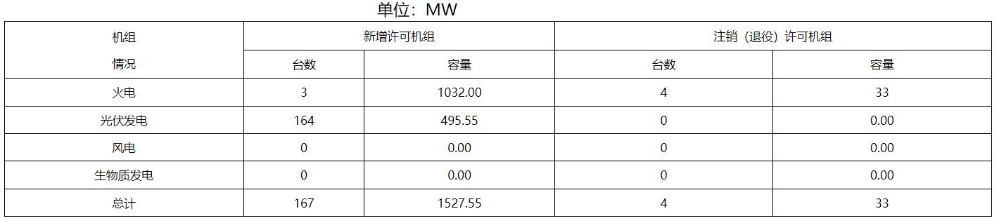 截止1月31日,2024年共辦理電力業務許可(發電類)業務17件,較去年同期增加21.4%,其中新申請5件,登記事項變更7件,許可事項變更3件,注銷2件。新增發電裝機167臺(發電單元)總容量1527.55MW,其中火電1032.00MW,光伏發電495.55MW。