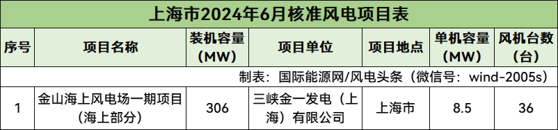 上海核準1個風電項目,總規模306MW,為海上風電項目。