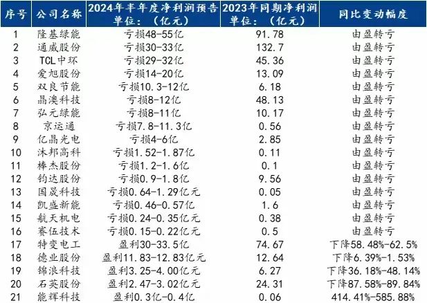 光伏板塊2024半年度凈利潤預告