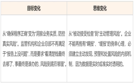 從目標(biāo)與思維看,過(guò)去監(jiān)管更關(guān)注“程序正確”,企業(yè)也常抱有“被動(dòng)接受檢查”的心態(tài);如今則轉(zhuǎn)向“洞察業(yè)務(wù)實(shí)質(zhì)、防控真實(shí)風(fēng)險(xiǎn)”——監(jiān)管機(jī)構(gòu)與企業(yè)總部不僅要“報(bào)告沒(méi)問(wèn)題”,更要“看清錢去哪、事誰(shuí)辦、風(fēng)險(xiǎn)在哪”,企業(yè)也必須建立主動(dòng)發(fā)現(xiàn)、預(yù)警、處置風(fēng)險(xiǎn)的機(jī)制,畢竟數(shù)據(jù)已實(shí)現(xiàn)實(shí)時(shí)或準(zhǔn)實(shí)時(shí)透明。