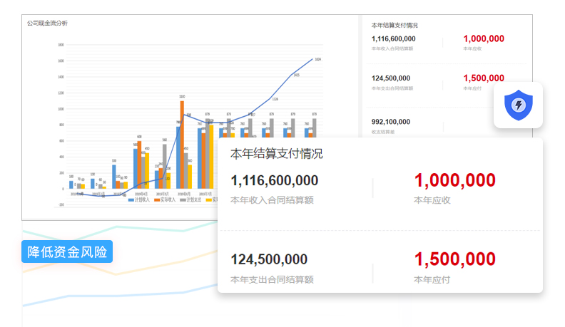 以前,財務用EXCEL表單記錄項目資金進出情況,數(shù)據(jù)匯總不及時、不準確、不互通,老板線下審批付款沒有數(shù)據(jù)參照,財務也沒有系統(tǒng),雙方數(shù)據(jù)割裂,容易導致收支失衡,引起資金鏈斷裂風險。如今,公司通過系統(tǒng)建立了項目付款計劃,隨時關注月度付款計劃執(zhí)行情況,到期應付、到期未付等關鍵指標也清晰可見。