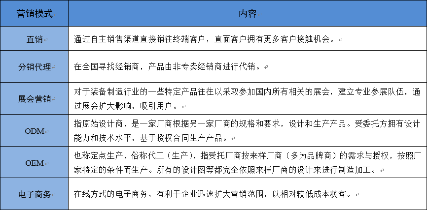 裝備制造業中由于子行業眾多,不同子行業經營銷售模式不完全相同,營銷側重點也有所不同。如汽車制造中的汽車整車營銷模式側重于經銷、專賣等模式,而諸如大型通用設備、電氣設備則側重于展會營銷、招投標等模式;在電子設備中OEM、ODM模式則較為普遍。