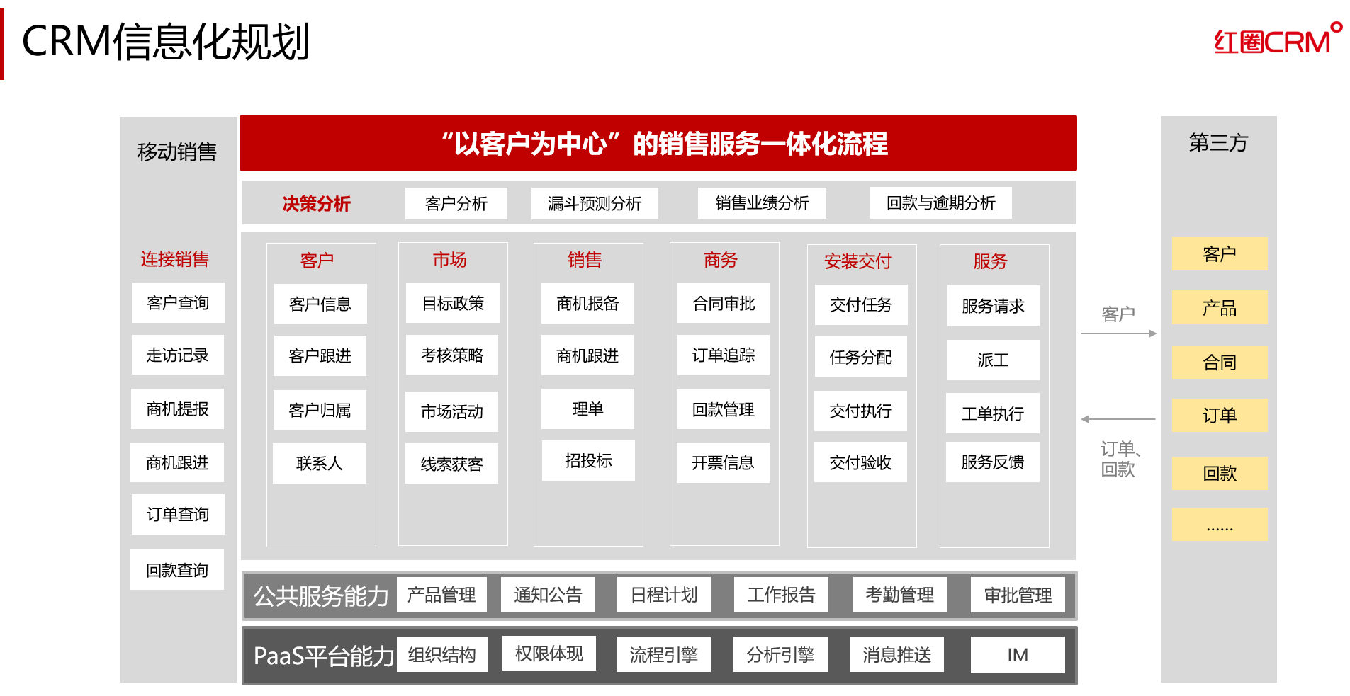 聚焦裝備制造企業,其產品多呈現為大型復雜、個性化、定制化和小批量等特點,且在產品制造、售后服務等業務環節都可能會有產品設計與工藝方案的調整,企業的業務模式具有明顯的多元化、個性化和碎片化特征,制造業企業必然面臨商業模式和管理模式雙重挑戰。為打通與改善企業從市場營銷、銷售、研發、采購、制造到客戶服務等核心業務環節,借助紅圈CRM打造統一客戶交互平臺,提升管理質效,為客戶創造更大的價值。